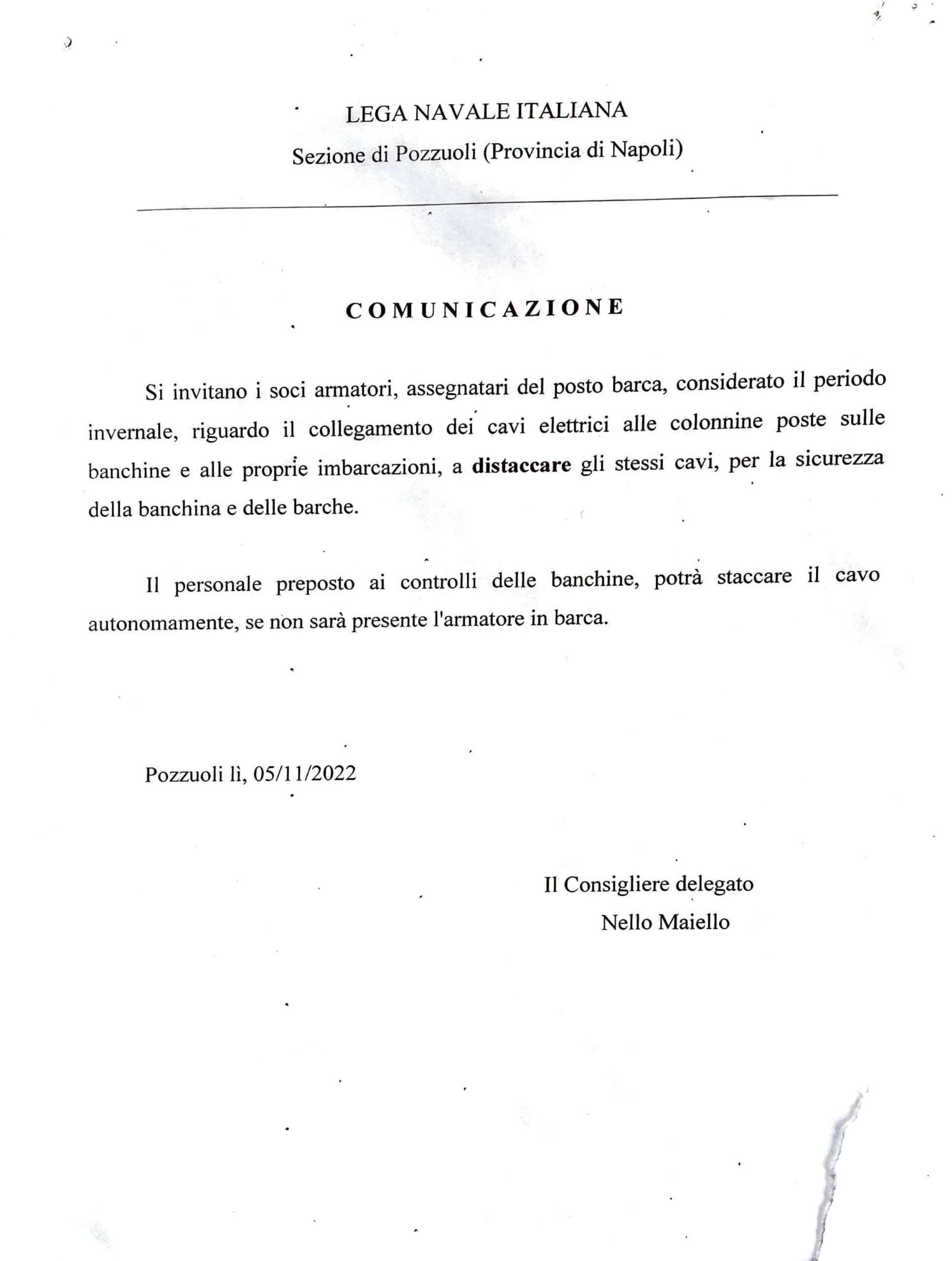 Si invitano i soci armatori, visto il periodo invernale, a distaccare i collegamenti dei cavi elettrici dalle colonnine poste sulla banchina.